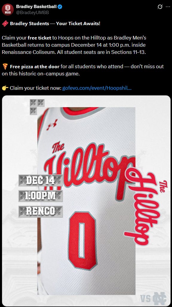 But, in this case, I can’t really fault Bradley for at least trying to get them to show up. I guess a 5-10 minute walk in the cold across campus was too much for them. At least the band sounded good and functions as our de-facto student section these days.