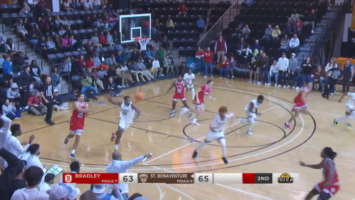 4:04 - The game stream cuts out. To make matters worse, the feed is frozen on one of the St. Bonaventure’s players dads with an extremely surly tone. I listened to the WMBD feed from Bradley, but going back and looking at the video, this guy was apparently right by the broadcasters and yelling loudly throughout the entire game. I don’t know if he ever said anything wrong, he was just very prominent on the broadcast. Fans were stuck with this image for the rest of the half and through halftime until the Field of 68 kicked off a new stream. Bradley trails 34-26 at the half.
